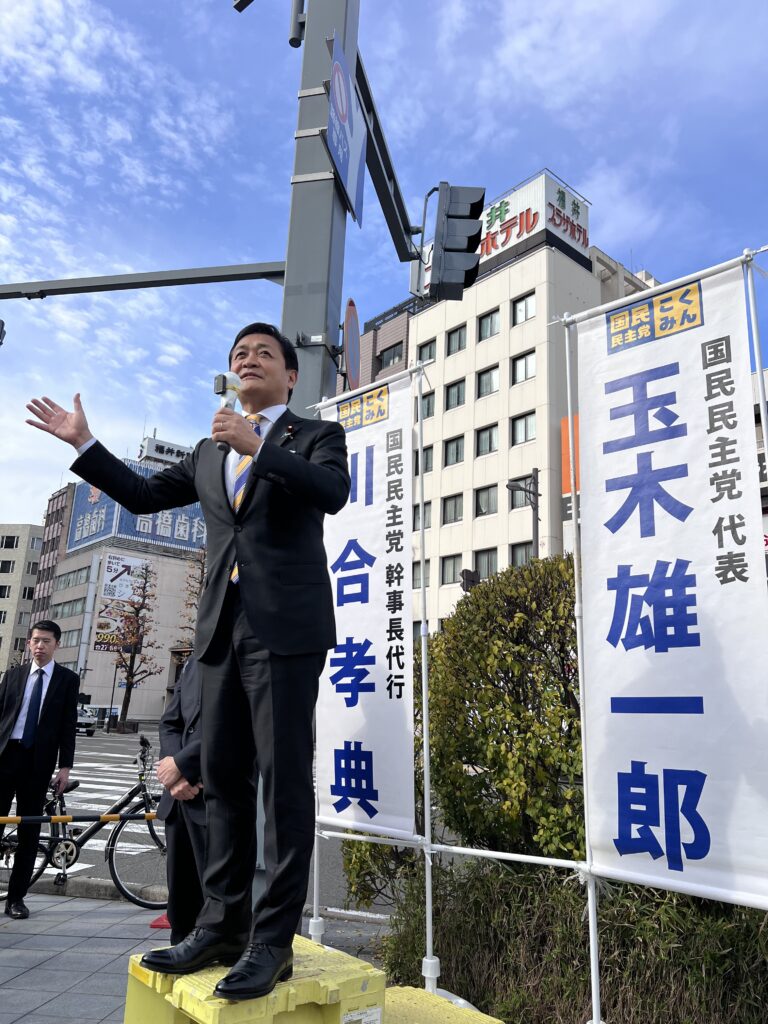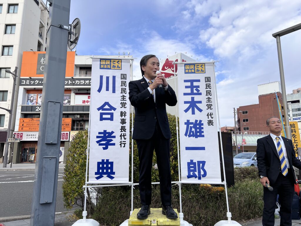 街頭演説会では、県連代表として川合幹事長代行より、「国民の皆さんの政治に対する信頼が失われた理由、それは政治家や政党が約束を守らなかったから。国民民主党は自分達が掲げた政策は何がなんでも実現しようと思って今も戦っている。」と、結党以来貫く思い、政治理念を訴えられました。