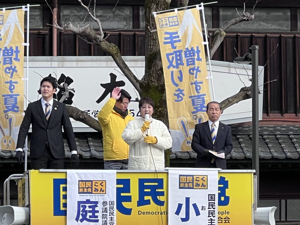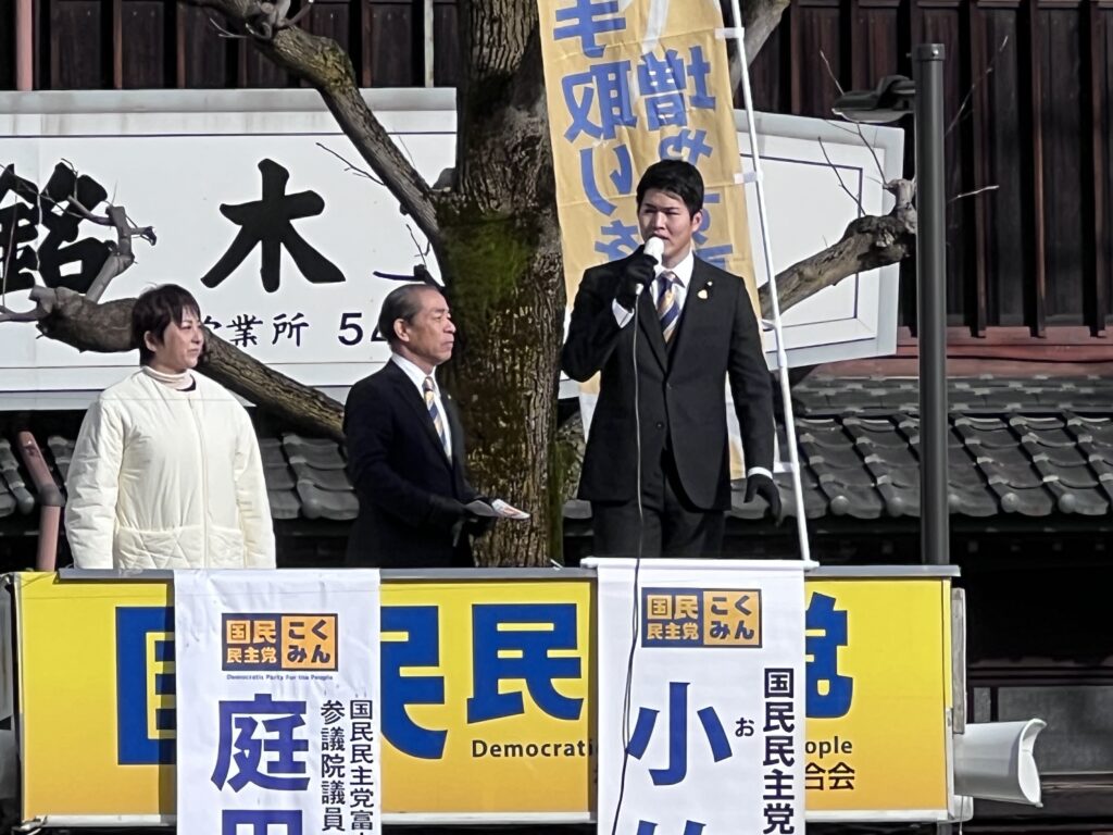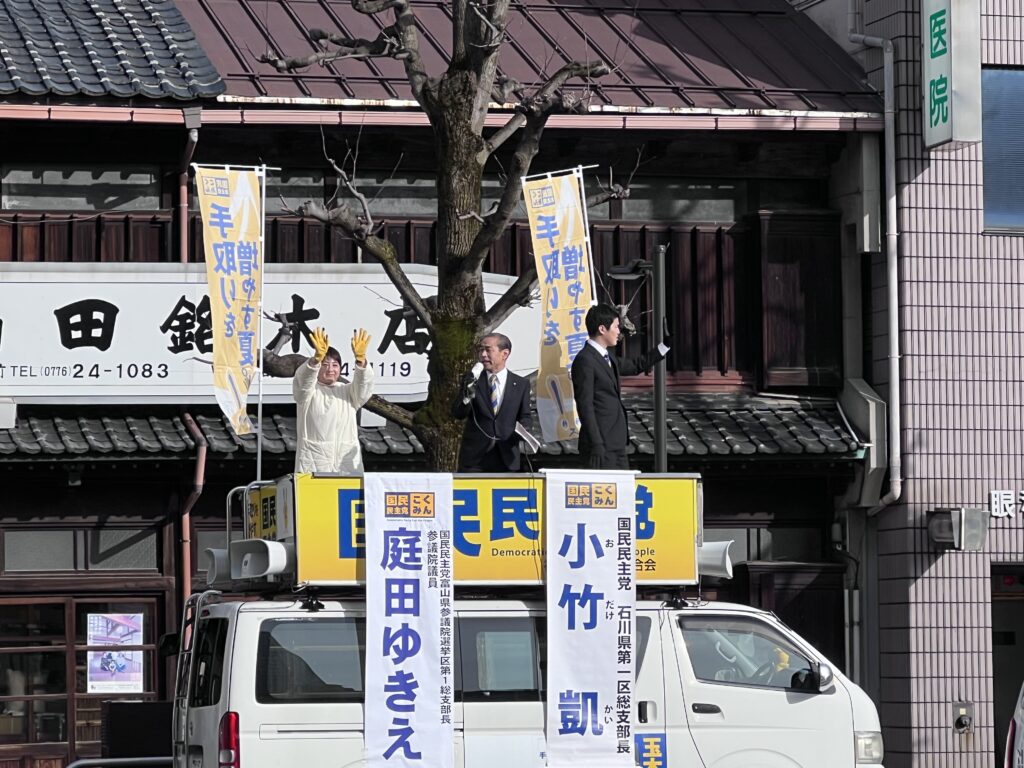 1月7日(水)9時50分より、福井駅前通りにて、小竹かい衆議院議員(石川1区)、庭田ゆきえ参議院議員(富山)にお越しいただき、福井を皮切りに石川、富山へとつなぐ「新年街頭演説会」を開催しました。