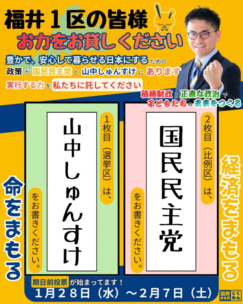 福井1区で、まさにラストスパートとばかりに、先を行く候補を追い上げに追い上げる国民民主党公認の「山中しゅんすけ」候補。